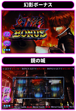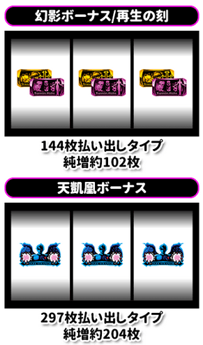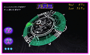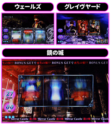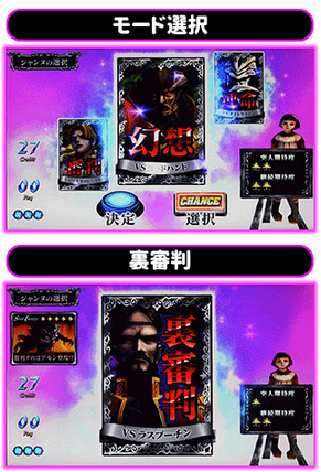 SLOTシャドウハーツII-運命の道標- 攻略ポイント 有効ライン&ペナルティ情報 ■メインリールはミニリールとなっている。有効ラインは中段のみの1ラインだが、レア小役は液晶リールで察知可能だ。ボーナスを揃える時のみミニリールを目押しする必要がある。なお、変則押しのペナルティはない。 通常ゲームのポイント ■ARTは通常時から突入することもあるが、ボーナス経由での突入がメインというのが、この機種ならではのもの。ボーナスは「再生の刻」となればART確定だが、「幻影ボーナス」からも抽選。また、通常時からのARTの前兆濃厚となる「鏡の城」ステージも存在する。 通常時の背景 ■通常時の背景は5種類。ドンレミとルアーブルは通常状態を示唆。ウェールズは高確を示唆。グレイヴヤードは前兆示唆で、約15G継続。鏡の城は最大20G継続する前兆濃厚ステージで、滞在中のボーナス成立は再生の刻となる。 ボーナスについて ■ボーナスは全部で9種類。フリーズを伴う「天凱凰ボーナス」は、純増204枚で高ループ率のARTも確定するプレミアム的な存在。それ以外は、黄BARと紫BARの並びが8種類で、純増は102枚。基本的に異色揃いよりも同色揃いのほうがART突入期待度は高くなっている。幻影ボーナスだが、通常時から当選した場合はART突入を抽選。ART中に当選した場合は、ARTゲーム数の上乗せを抽選する。 幻影ボーナス ■通常時から当選した幻影ボーナスでは、4つのモードから好みのものを選択しよう。選んだモードによって、ARTへの突入率と突入時の継続率が変化する。幻想……突入率★★ 継続期待度★★運命……突入率★★★ 継続期待度★審判……突入率★ 継続期待度★★★★裏審判……突入率★ 継続期待度★★裏審判は、MAXBETボタンを長押しすると出現する。期待度は低いが、当選時はARTの初期ゲーム数が優遇されるぞ。 ジャッジメントリング ボーナス中は「ジャッジメントリング」が発生する可能性あり。リングには色がついており、3リールとも色のある部分でストップボタンを押せれば成功。これによって、ART突入抽選やARTゲーム数上乗せを抽選する。1周で一気に押すと設定示唆のキャラボイスが発生するが、無理をして失敗してはもったいない。慣れるまでは確実に色のあるところで押すようにしよう。なお、ヒットエリアは範囲が大きいほど期待大。色はオレンジよりも緑のほうがアツいぞ。 【ART】幻影ラッシュ ART「幻影ラッシュ」は、突入時に「フュージョンドライヴ」でゲーム数を決定する。この際に出現するモンスターによって獲得ゲーム数の期待度が変化。最低保証は30Gだが、もっとも強力な“アモン”出現時は最低150G以上となる。なお、このフュージョンドライヴは、ART中にも発生する可能性あり。 通常時の手順 ■レア小役は液晶リールで察知できる。ミニリールは目押しをしなくて大丈夫だ。 レア小役 ■液晶リール上にチェリーやスイカが揃ったらレア小役となる。チェリーとスイカは、それぞれ強弱も存在するが、強レア小役となった場合は効果音が発生するので、停止形を覚える必要はない。ハズレ時に効果音が発生したらチャンス目となるぞ。 レア小役の期待度 ■レア小役成立時は、ボーナスとART当選に期待。期待度は「弱チェリー・弱スイカ<チャンス目<強スイカ<強チェリー<中段チェリー」だ。 PR