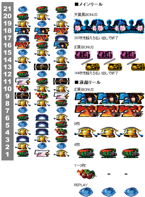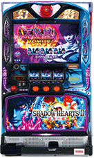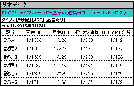 SLOTシャドウハーツII-運命の道標-(ユニバーサルブロス)基本情報 リール配列 CAST ※配当は見た目上の図柄の一部で、実際の役構成とは異なります。※リール配列は液晶上のものです 『SLOTシャドウハーツII-運命の道標-』は次世代型の技術介入要素“ジャッジメントリング”を搭載しているが、ボーナスを揃える以外に目押しは必要ない。 ゲームは好きだったというパチスロ初心者でも安心して楽しめる部類の機種だ。ボーナスは全部で9種類。フリーズを伴う「天凱凰ボーナス」は、純増204枚で高ループ率のARTも確定するプレミアム的な存在。 それ以外は、黄BARと紫BARの並びが8種類で、純増は102枚となっている。ボーナス中は“ジャッジメントリング”が発生する可能性あり。リングには色がついており、3リールとも色のある部分でストップボタンを押せれば成功。これによって、ART突入抽選やARTゲーム数上乗せを抽選してくれる。ART「幻影ラッシュ」は、1Gあたり約2.1枚の純増(ボーナス込み)。ゲーム数は、突入時に発生する上乗せ特化演出のフュージョンドライヴで決定される。 この際に出現するモンスターによって獲得ゲーム数の期待度が変化。最低保証は30Gだが、もっとも強力なアモン出現時は最低150G以上となる。 なお、このフュージョンドライヴは、ART中にも発生する可能性があるぞ。 PR