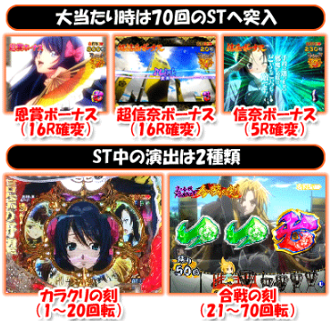 CR織田信奈の野望 攻略ポイント ゲームの流れ ■大当たりとなると70回のSTへと突入する。ST突入率は100%となっているが、電サポの付かない5R確変が存在する。ただし、潜伏中の大当たりは電サポ70回が付く仕組みになっている。 ST前半20回は「カラクリの刻」。後半50回は「合戦の刻」となり、バトルを楽しめるようになっている。 つづきはこちら